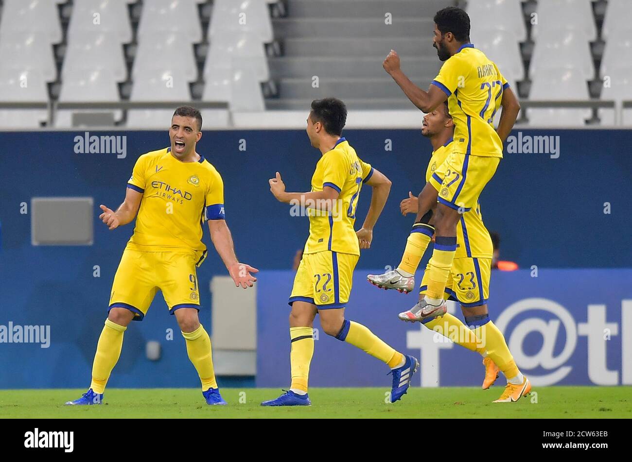 Doha Katar September 2020 Abderazak Hamdallah L Von Al Nassr Feiert Torreigen Wahrend Der Afc Asian Champions League Runde Des Fussballspiels 16 Zwischen Taawoun Fc Und Al Nassr Von Saudi Arabien Im Education